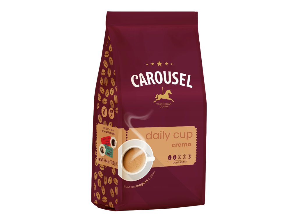 A Carousel Daily Cup Cream kávébabok 500g egy finom kávé, telt aromával, alacsony savassággal és finom gabona- , mogyoró- és szerecsendió- jegyekkel . Ez a kávé önmagában is finom, de tejszínnel is keverhető. Ez a kávé Arabica és Robusta kávébabok keverékéből készül, tökéletesen kiegyensúlyozva az autentikus íz érdekében.